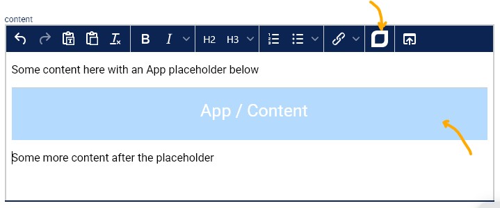 Click on the icon shown when editing text to add an App/Content Block placeholder.