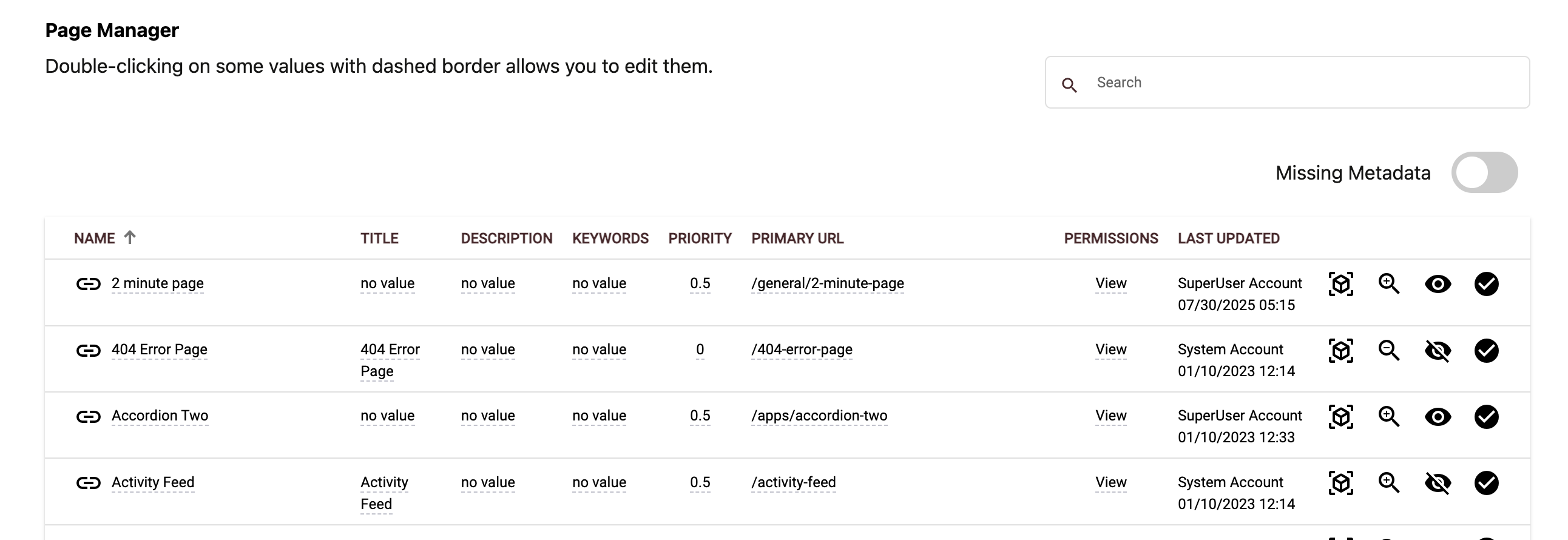 Use the "missing metadata" option to show pages with one ot more items that need to be added.